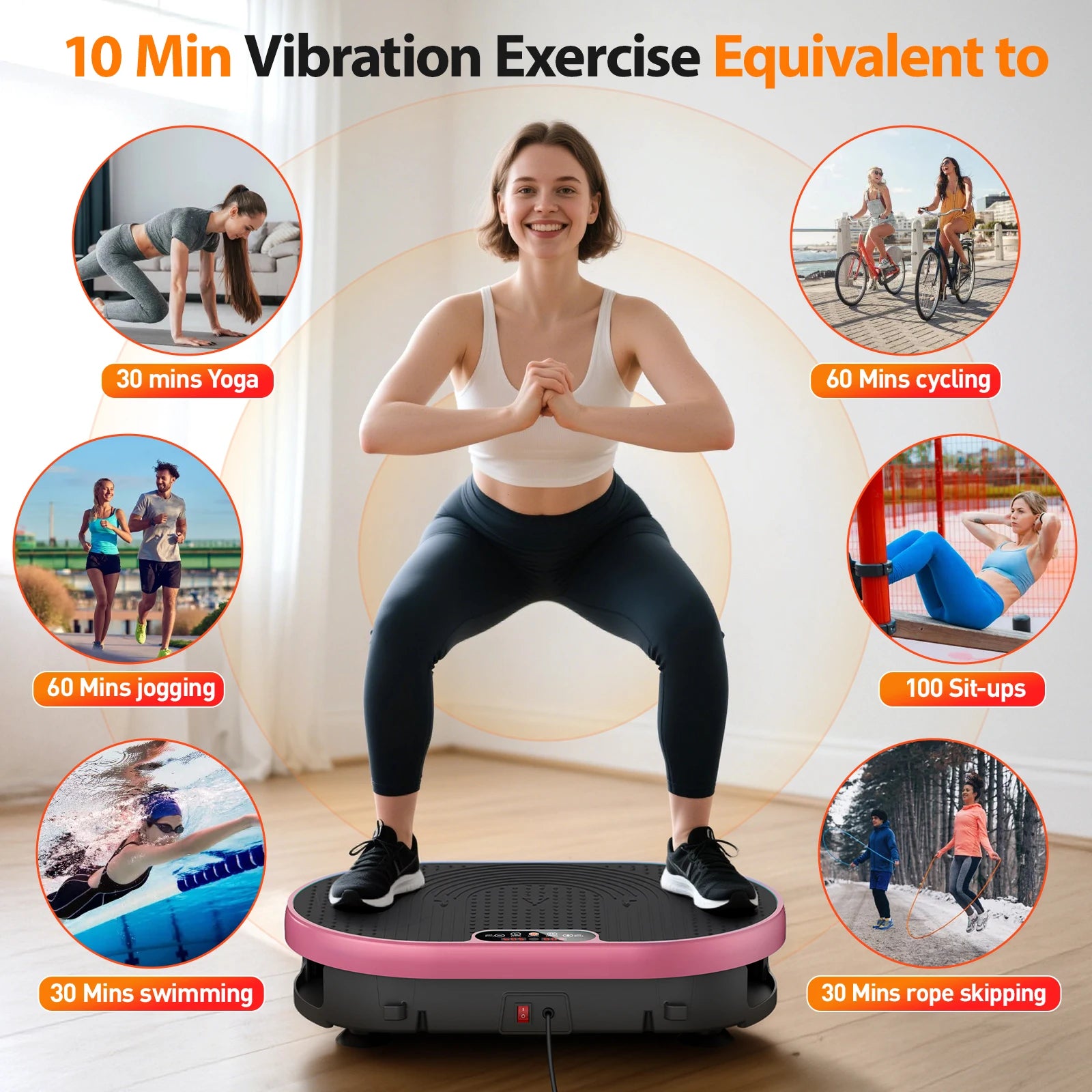 - Full-body activation with high-frequency vibrations engages your core, hips, arms, and legs to support lean muscle and steady fat metabolism in just 10 minutes.